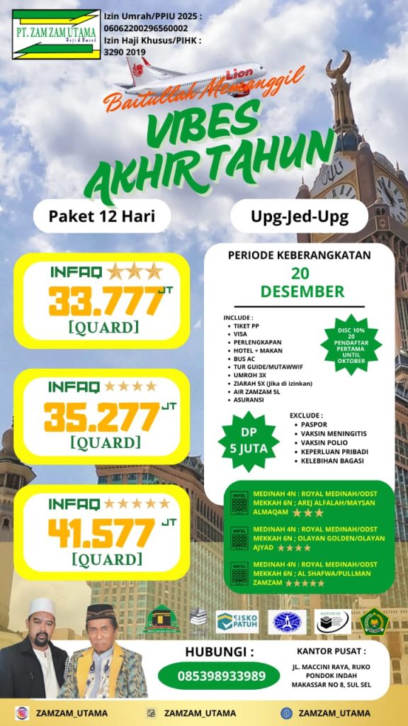 Umrah akhir tahun bersama Zamzam Utama dengan program perjalanan 12 hari dengan banyak pilihan harga dan fasilitas.
