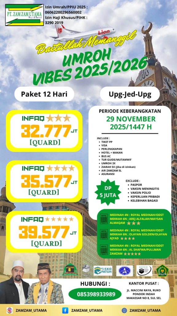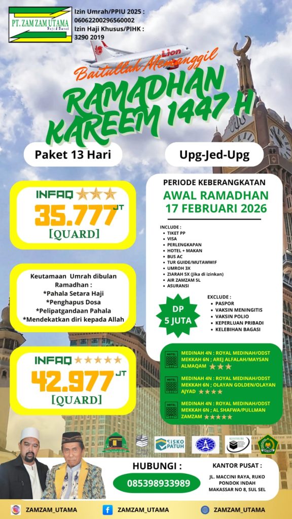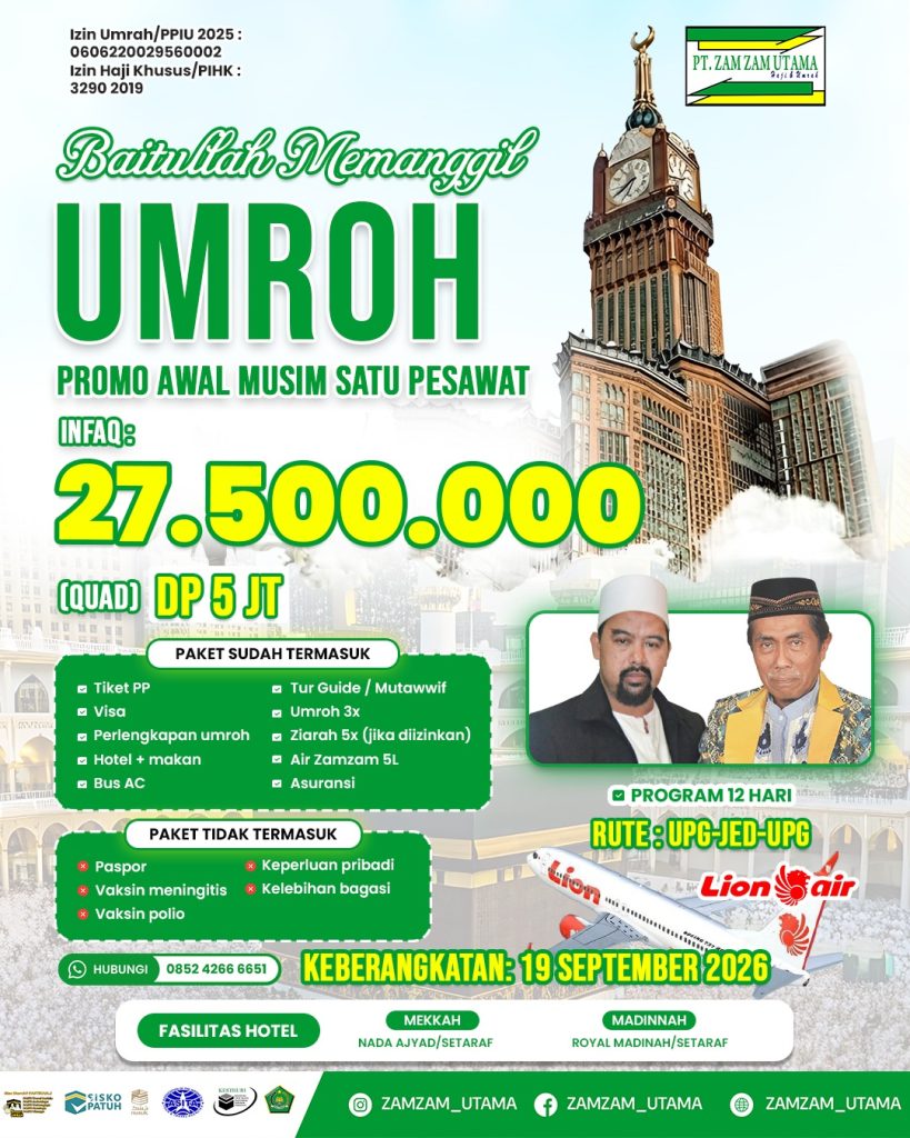 Dapatkan paket umrah di awal musim 2026 dengan harga sangat terjangkau serta fasilitas menarik dari Zamzam Utama. Harga mulai dari 27jutaan.