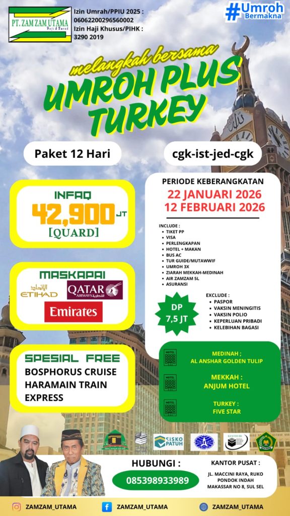 Paket umrah plus Turki bersama Zamzam Utama di bulan Januari dan Februari 2026 dengan progran perjalanan selama 12 hari. Dapatkan spesial free di Bosphorus Cruise, Haramain Train, Express.